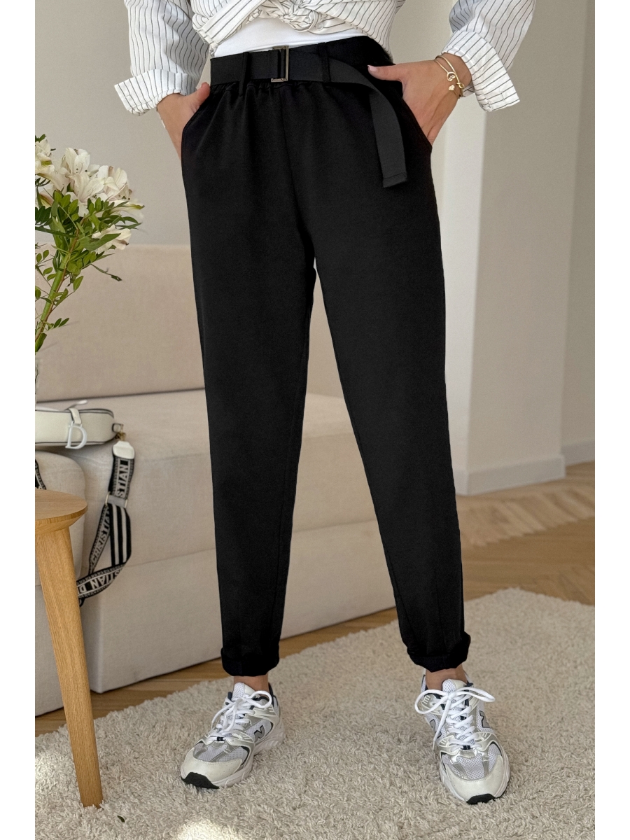 Брюки женские из трикотажной хлопковой ткани (двунитка), слегка заужены к низу. В боковых швах расположены карманы. По низу передних половинок есть защип. Задняя половинка брюк с отрезной кокеткой и накладными карманами. Вверх брюк обработан поясом с резинкой (без молнии).