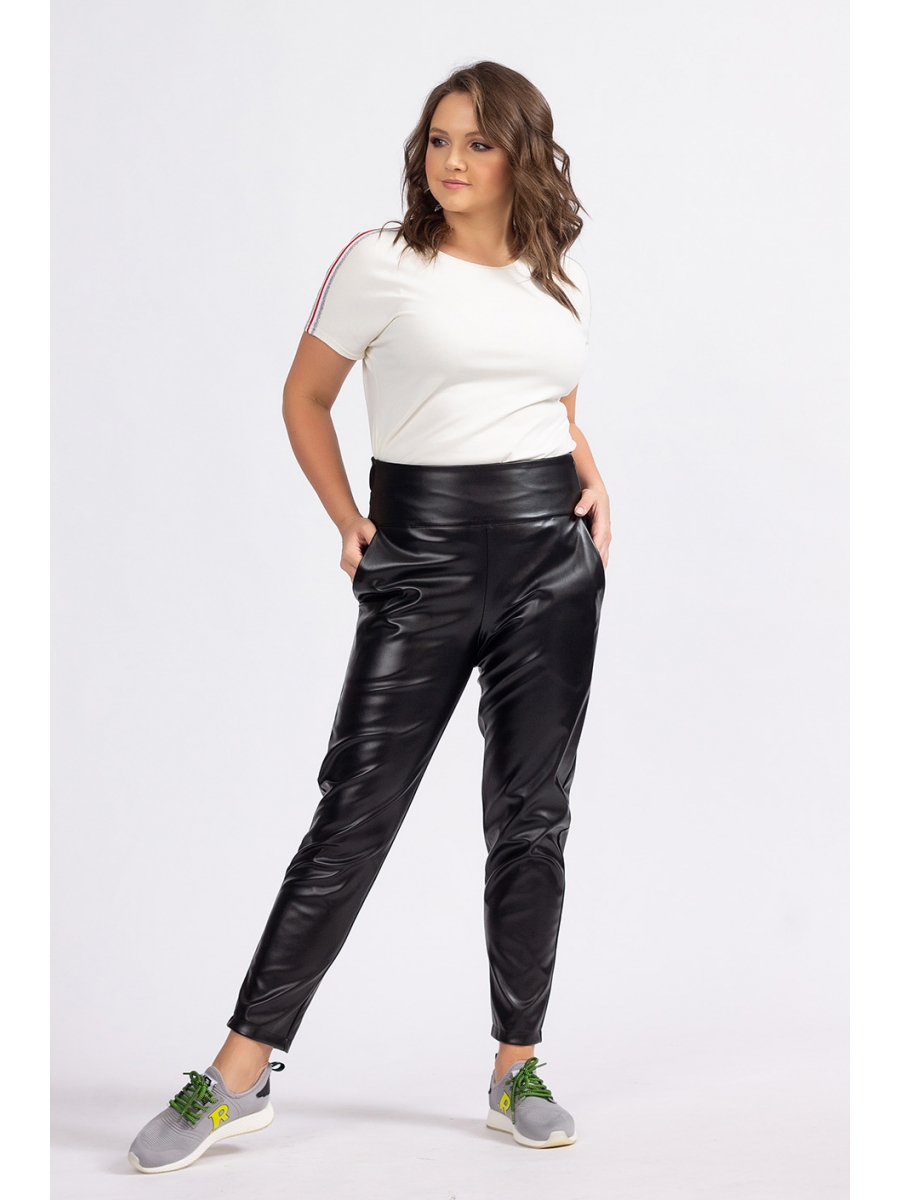 Ткань: экокожа. Брюки спереди – пояс-кокетка, сзади – на резине, в боковых швах – косые карманы, книзу заужены.