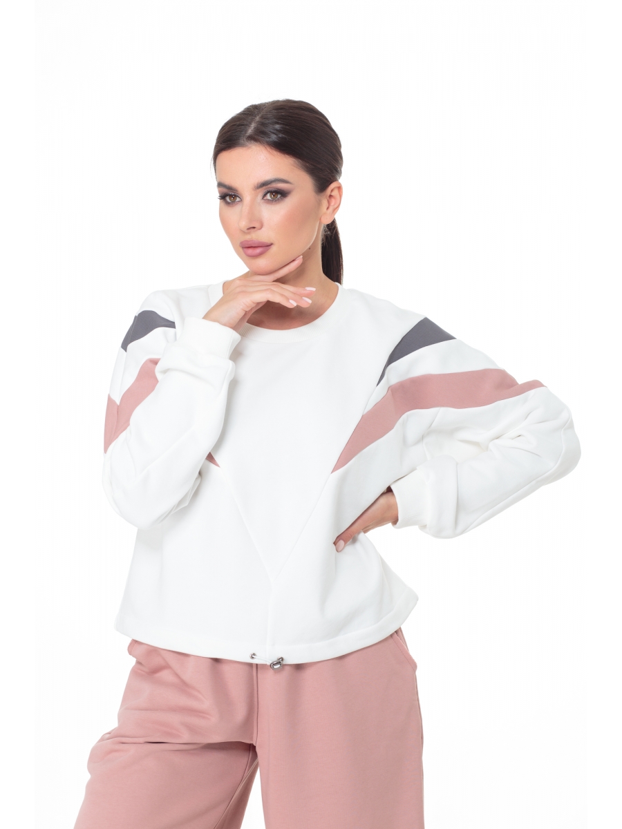 Свитшот с оригинальными подрезами пастельных тонов по переду и спинке, прямого силуэта, с длинным рукавом на манжете.