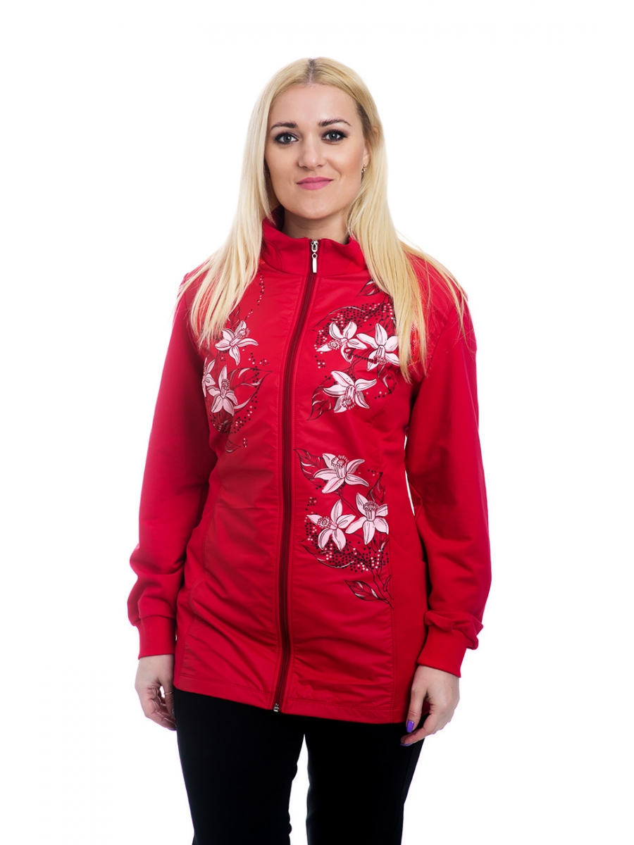 Жакет прямого силуэта. На центральные детали переда настрочена плащевка, с нанесенным на нее печатным рисунком. Воротник-стойка. Застежка жакета на тесьму-молнию. Рукава длинные, слегка заужены к низу, с притачными манжетами.