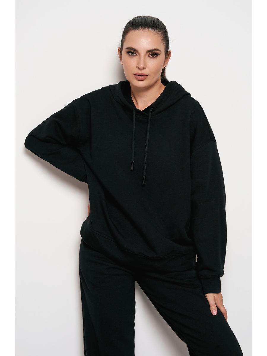 Женский худи с капюшоном свободного силуэта выполнен из высококачественного футера 3-х нитки класса "пенье". Лицевая сторона ткани гладная, изнанка - петлеобразная. Изделие имеет спущенную линию плеча и длинные рукава с углубленной проймой. Низ худи и рукавов выполнены с планками без резинок, в капюшон вставлен декоративный шнур.