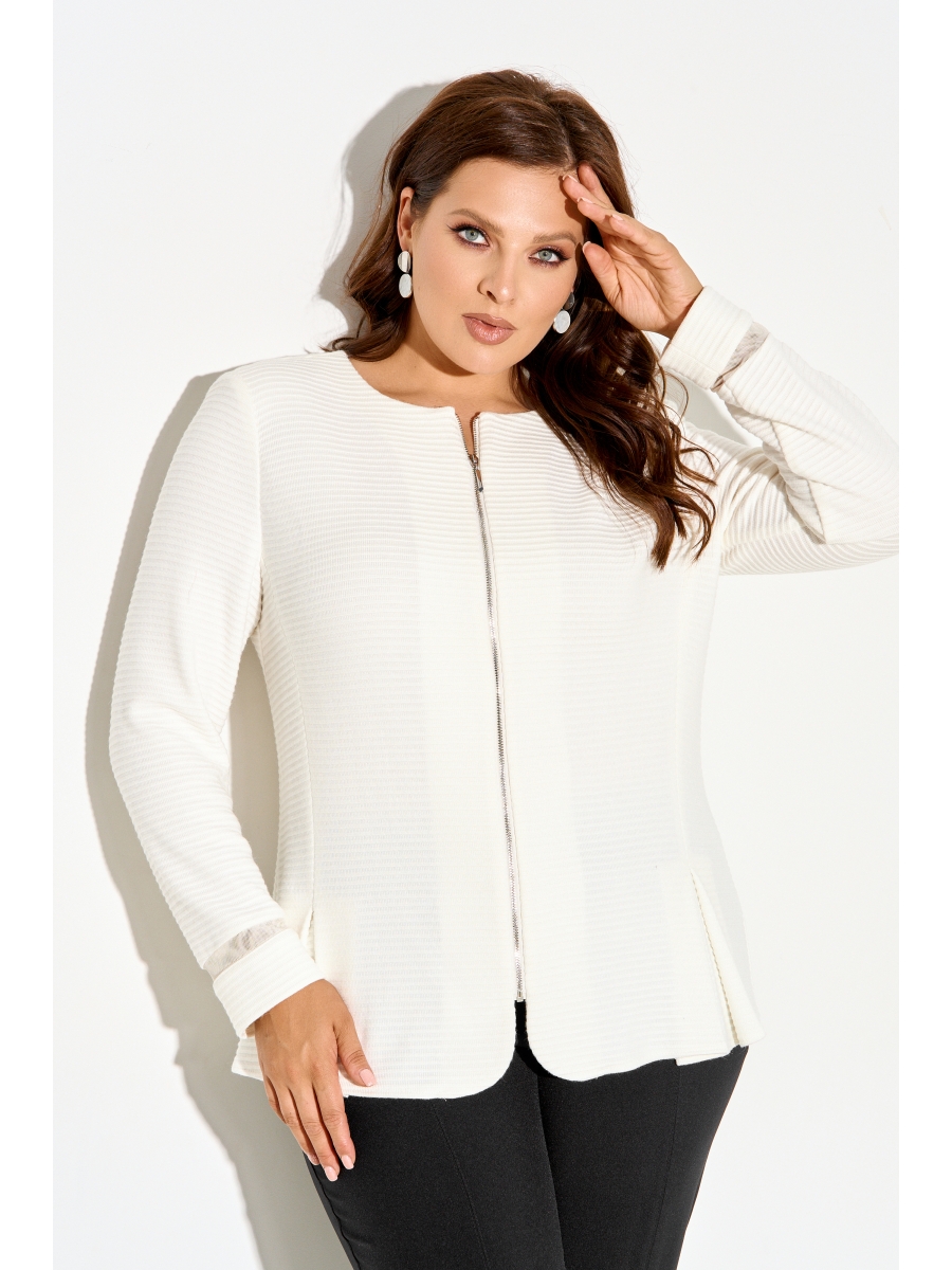 Джемпер полуприлегающего силуэта из мягкого трикотажного полотна в рубчик со втачными рукавами и округлым вырезом горловины; по переду небольшая мягкая складка и застежка на молнию; по низу рукавов декоративные вставки из сетки в тон основной ткани.