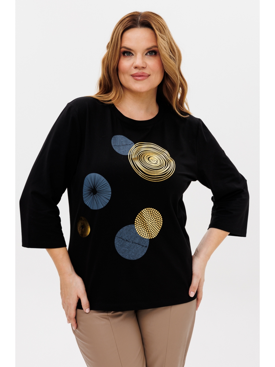 Джемпер женский из трикотажной ткани. По переду расположен принт. Рукав втачной, одношовный 3/4. Вырез горловины круглый, оформлен притачной бейкой.