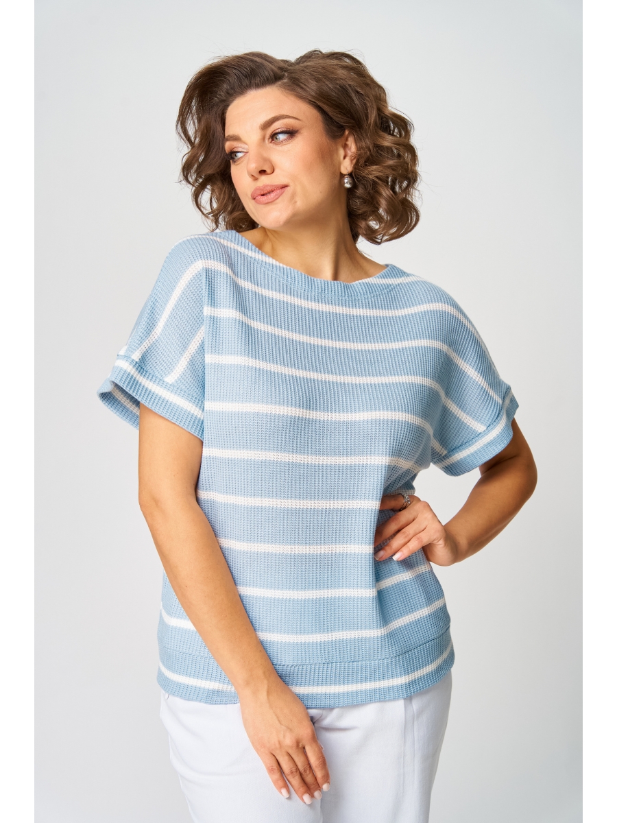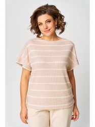 Джемпер женский из трикотажной вязаной ткани. Свободного силуэта. Спущенное плечо, оформлено притачной манжетой. Низ джемпера оформлен притачным поясом. Вырез горловины по спинке треугольный.