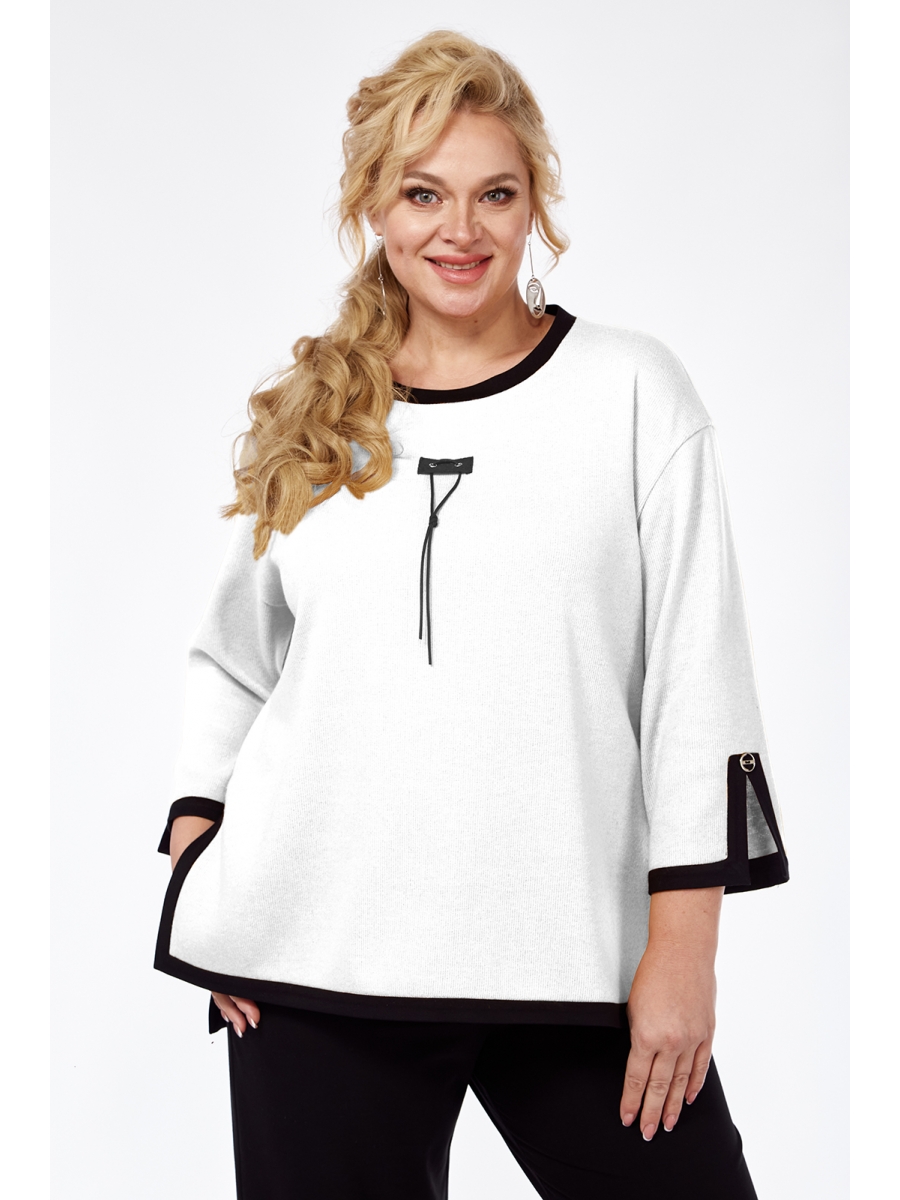 Джемпер женский, прямого силуэта из трикотажного полотна. По горловине, низу изделия и низу рукавов обработаны отделочные детали. В боковых швах разрезы внизу, также разрезы по низу рукавов, декорированы пуговицами. Рукав спущенный на полочке вверху настрочен декоративный элемент.