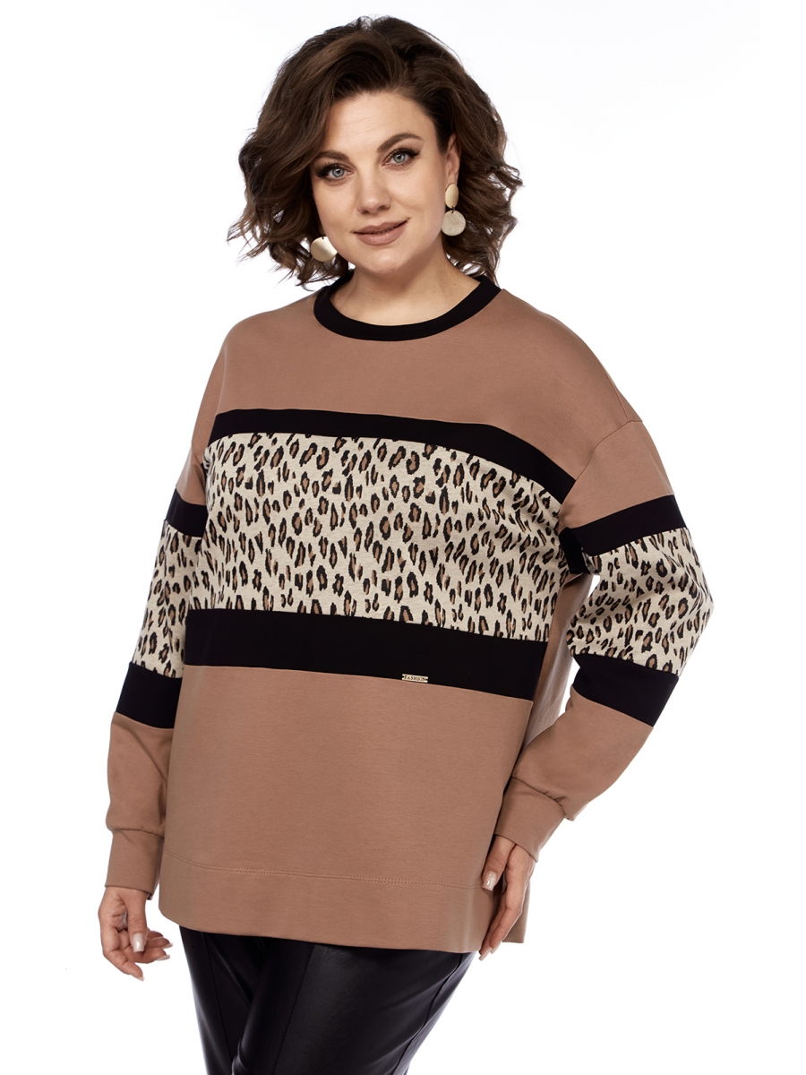 Джемпер женский, выполнен путем комбинирования тканей разной расцветки, из трикотажного полотна, свободного силуэта. Горловина округлой формы обработана планкой. Перед и рукава разрезные с декоративными вставками. Спинка цельнокроеная. Рукава спущенные на манжете.