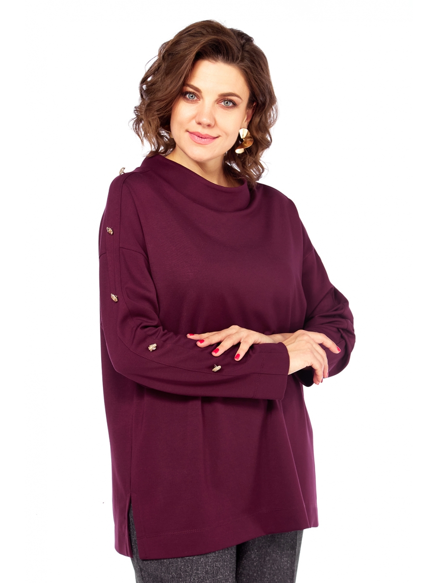 Джемпер женский свободного кроя, выполнен из трикотажного полотна. Перед цельнокроеный, спинка со средним швом. Рукава спущенные, от горловины до низа рукава вставка, декорированная с одной стороны пуговицами. Горловина с воротником стойка. В боковых швах разрезы.