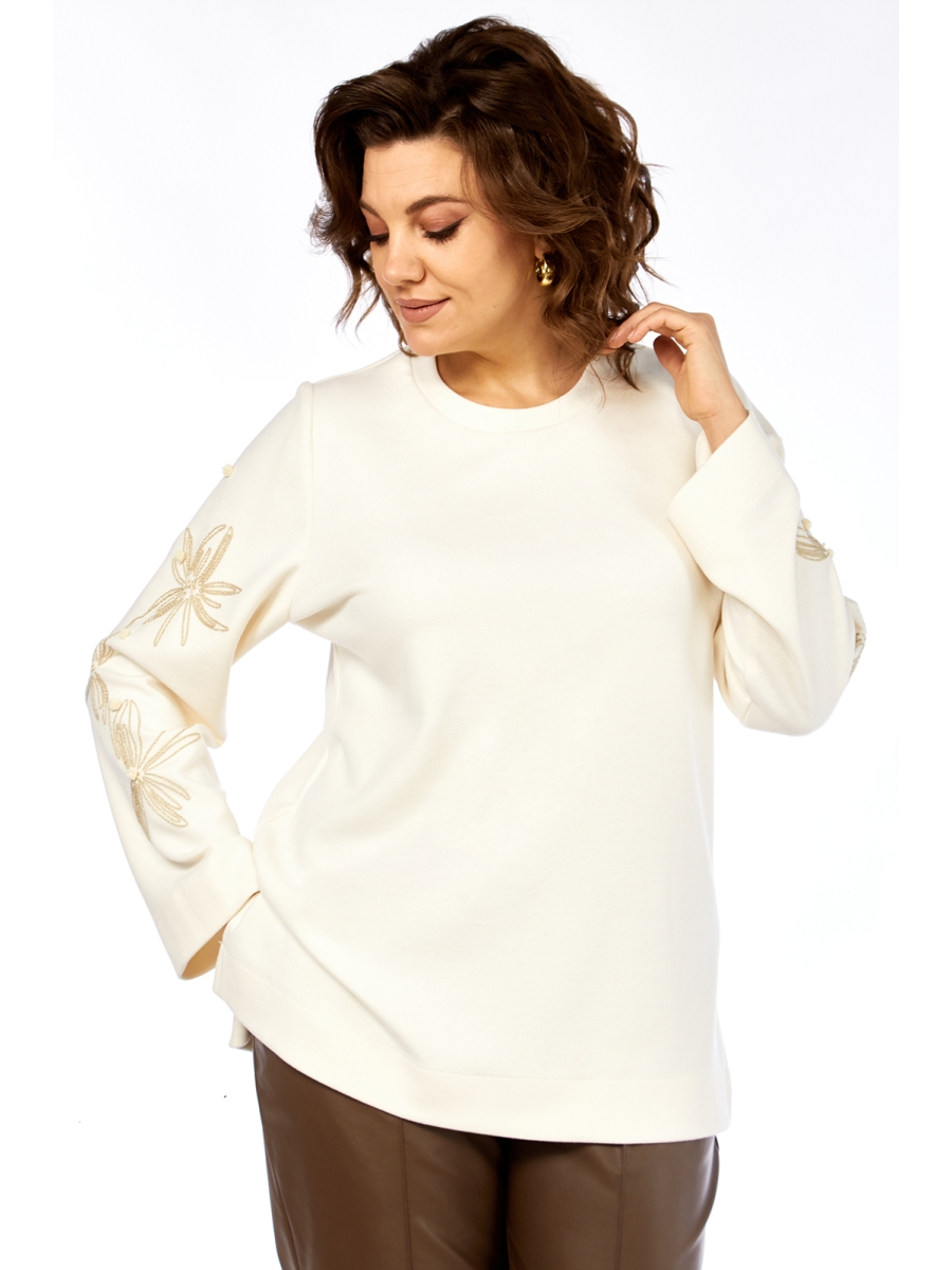 Джемпер женский, выполнен из трикотажного полотна. Перед и спинка цельнокроеные. Горловина круглой формы. Рукава втачные, декорированны вышивками и помпонами.