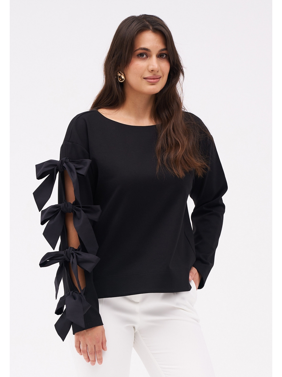 Джемпер из трикотажного полотна с хлопковыми бантами-завязками по рукаву. Боковые швы с разрезами внизу слегка перенесены на перёд.