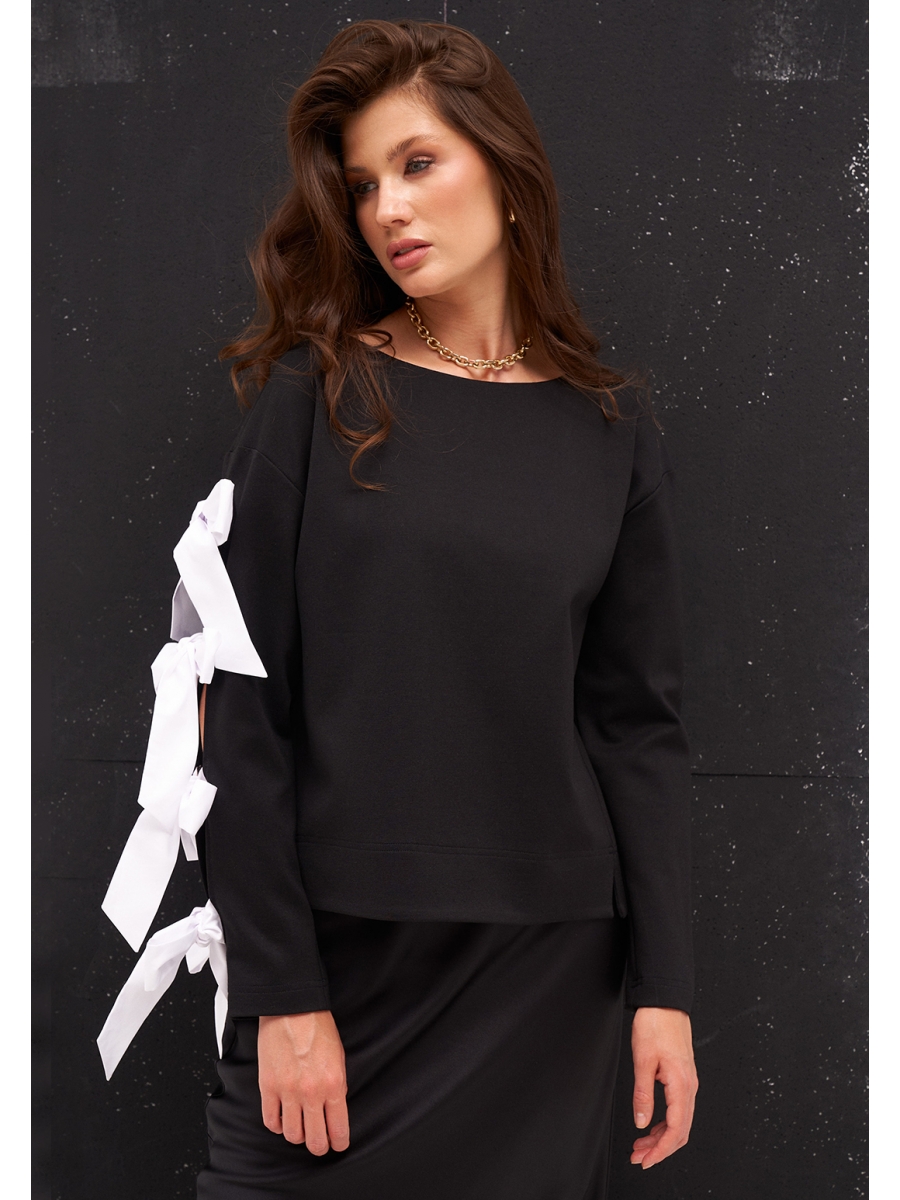 Джемпер из трикотажного полотна с хлопковыми бантами-завязками по рукаву. Боковые швы с разрезами внизу слегка перенесены на перёд.