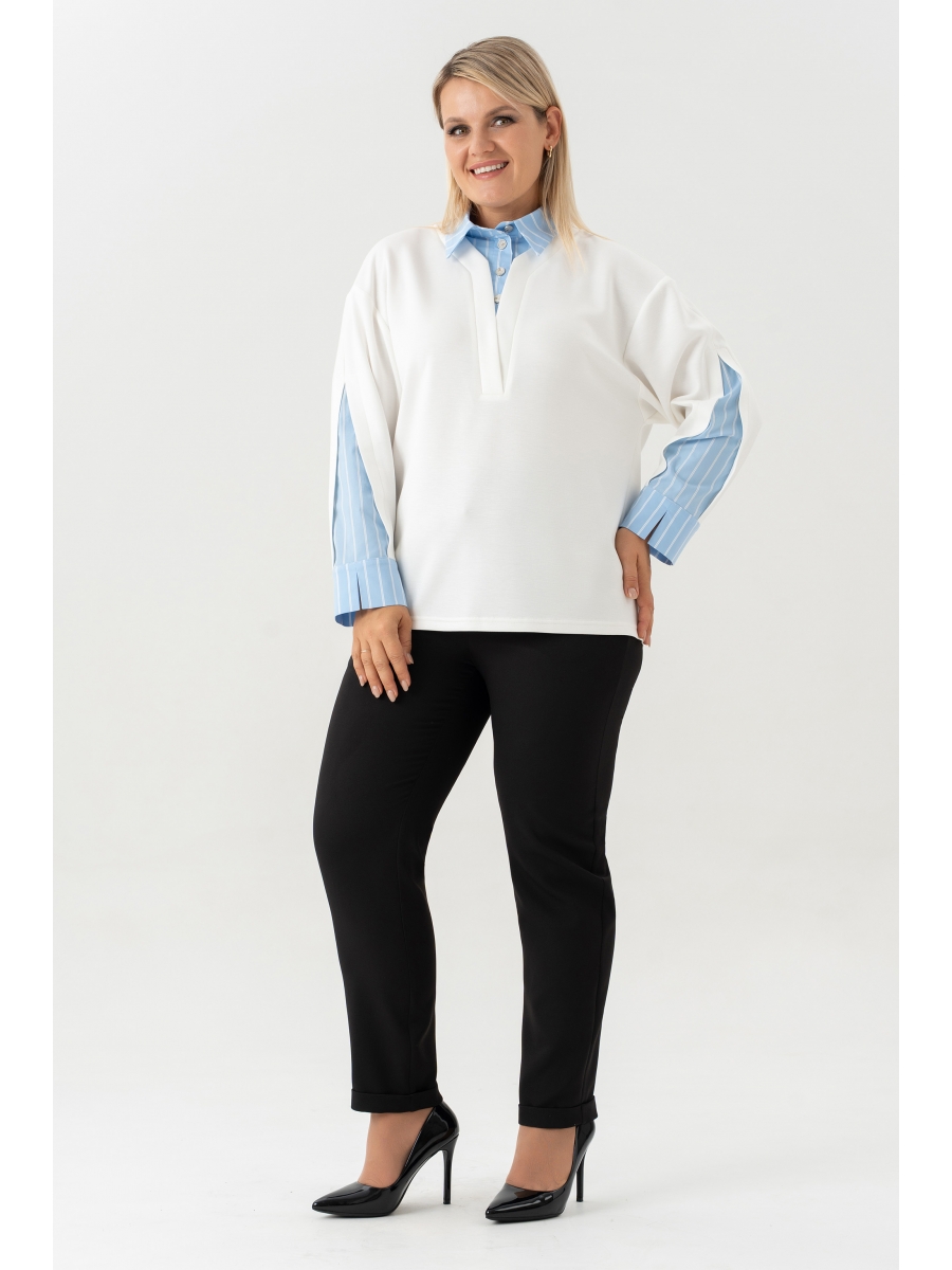Практичный и удобный – он станет Вашим любимым костюмом, а трендовый дизайн делает его актуальным решением для девушек, которые следят за модой. Свитшот женский с имитацией рубашки- новинка коллекции. Изготовленный из качественного трикотажа и полоски на х/б основе, он обеспечивает дышащие свойства и гипоаллергенность, что особенно важно для женщин с чувствительной кожей. Подходит на осень, весну и для зимы. Ткань необычайно мягкая и приятная к телу. Свободный оверсайз крой изумительно подойдет для девушек и женщин больших размеров. На свитшоте обработан воротник и  застежка –планка на петли и пуговицы. Рукав комбинирован из двух тканей, с манжетой и разрезом. Модель подходит для высоких и для невысоких. Брюки с удобной ,высокой посадкой и боковыми карманами позволяют хранить мелкие вещи, такие как ключи или смартфон, что делает этот костюм не только стильным, но и практичным. По низу брюк обработаны манжеты. Пояс частично на резинке, застежка на молнию и петлю  с пуговицей.