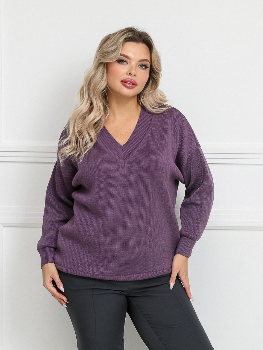 Эффектный джемпер свободного силуэта фиолетового цвета. Джемпер выполнен в технике «ручного вязания» из натуральных хлопковых нитей. V-образный вырез изделия обработан двусторонней лицевой бейкой. Низ изделия и втачные рукава обработаны манжетами, выполненные в технике «резинка».