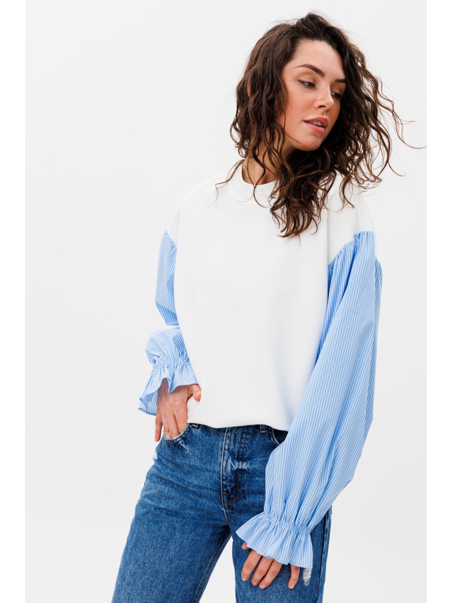 Стильный женский джемпер из качественного футера 3-х нитка и блузочной ткани на рукавах. Джемпер свободного силуэта, округлая горловина, плечо приспущено, рукав объемный расширенный, собран на тонкую резинку, за счет сборки создается эффект «рюши». Низ джемпера и горловина из кашкорсе. ​​​Джемпер можно с легкостью комбинировать с различными вещами и обувью Вашего гардероба.