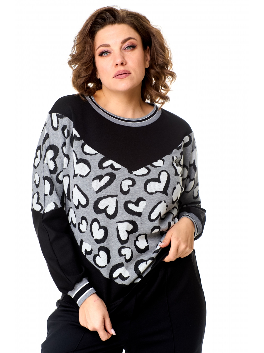 Стильный джемпер в дизайне «Сердце», комбинированный с черный. Свободного силуэта, с декоративными манжетами по горловине и низу рукава. Без застежки. Рукав реглан.
