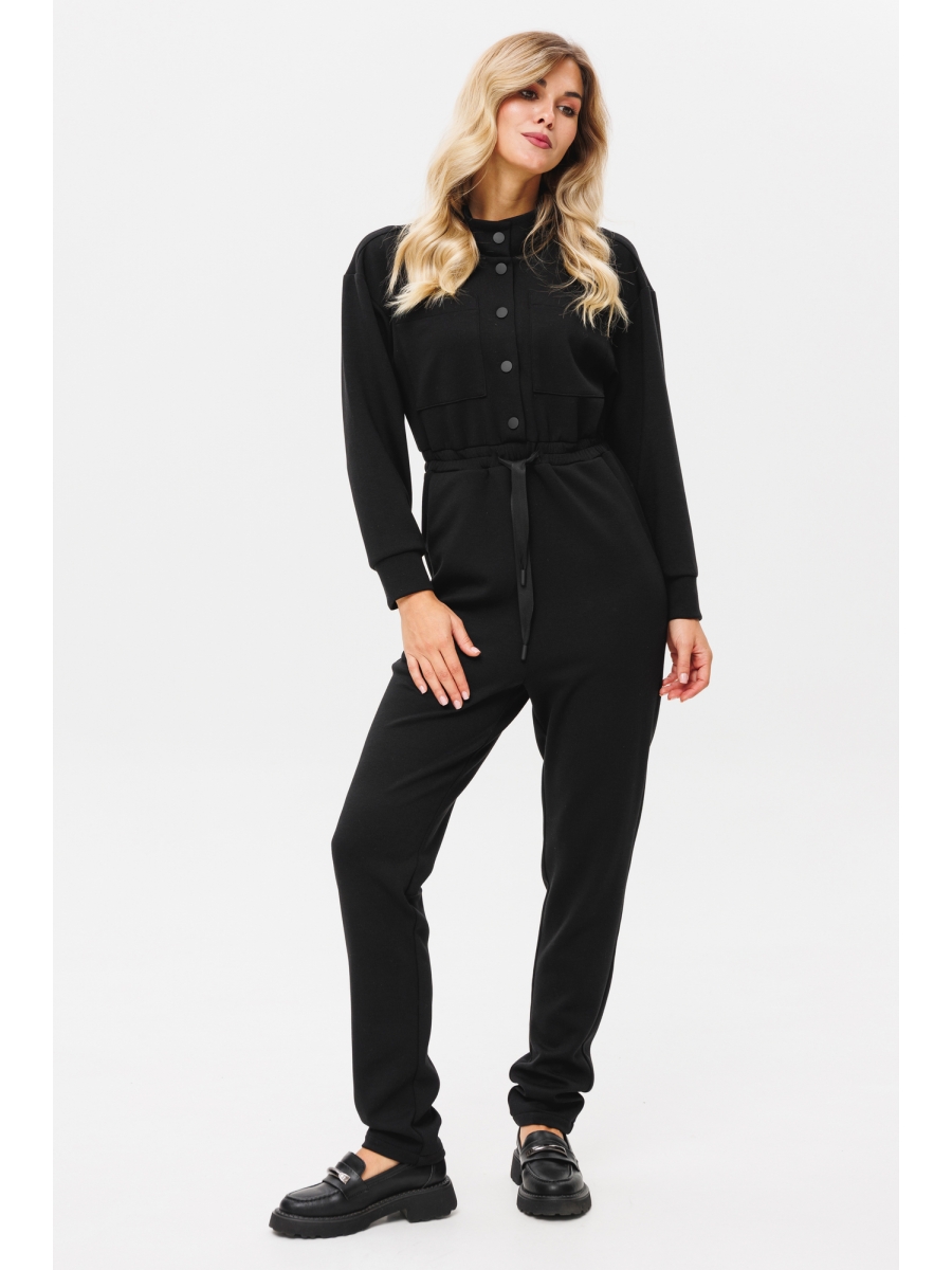 Комбинезон женский из трикотажной ткани отрезной по линии талии. На верхней части изделия расположены накладные карманы. Рукав спущенный с манжетой. Вырез горловины оформлен стойкой. В боковых швах расположены карманы. По талии вставлена резинка и тесьма. Комбинезон застегивается на кнопки.