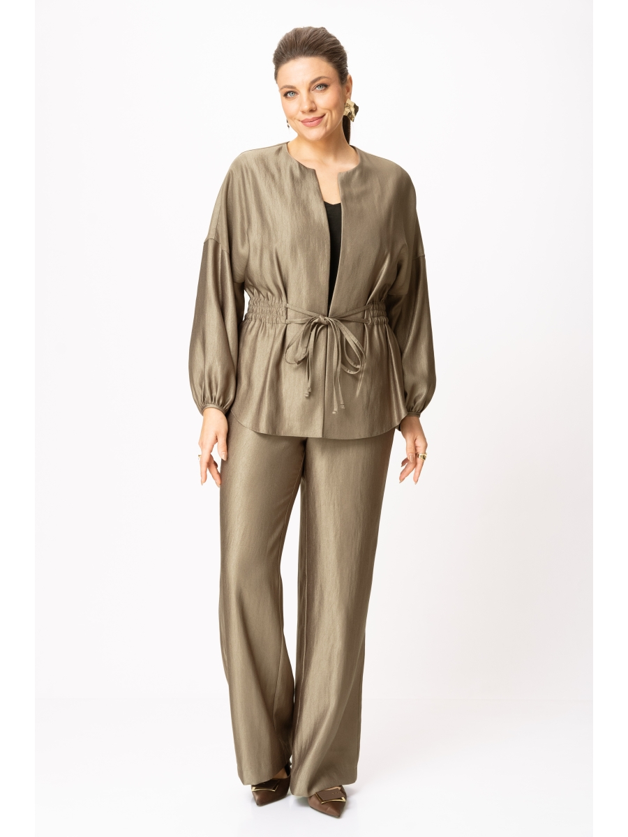 Жакет свободного силуэта со спущенной линией плеча, горловина круглая. Жакет без застежки, фиксируется на уровне талии завязками. Рукава 3/4, со сборкой по низу. Жакет без подкладки.
