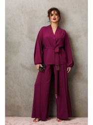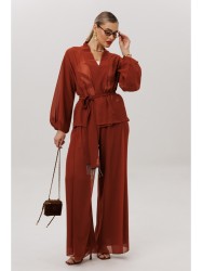 Элегантный вечерний костюм-двойка из шифона, состоящий из блузки свободного кроя и широких брюк.