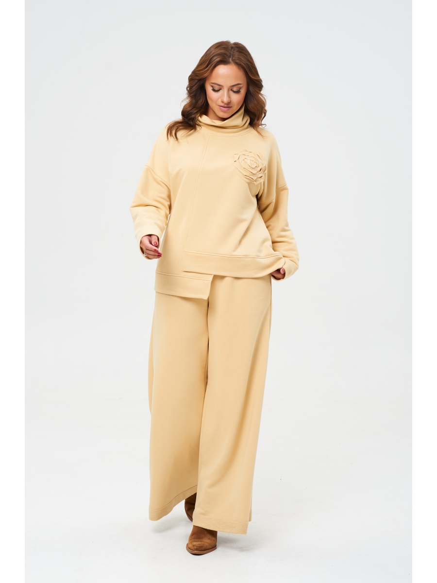 Брюки, расширенные к низу, пояс на резинке, по бокам карманы. Отворот по низу на изнанку.