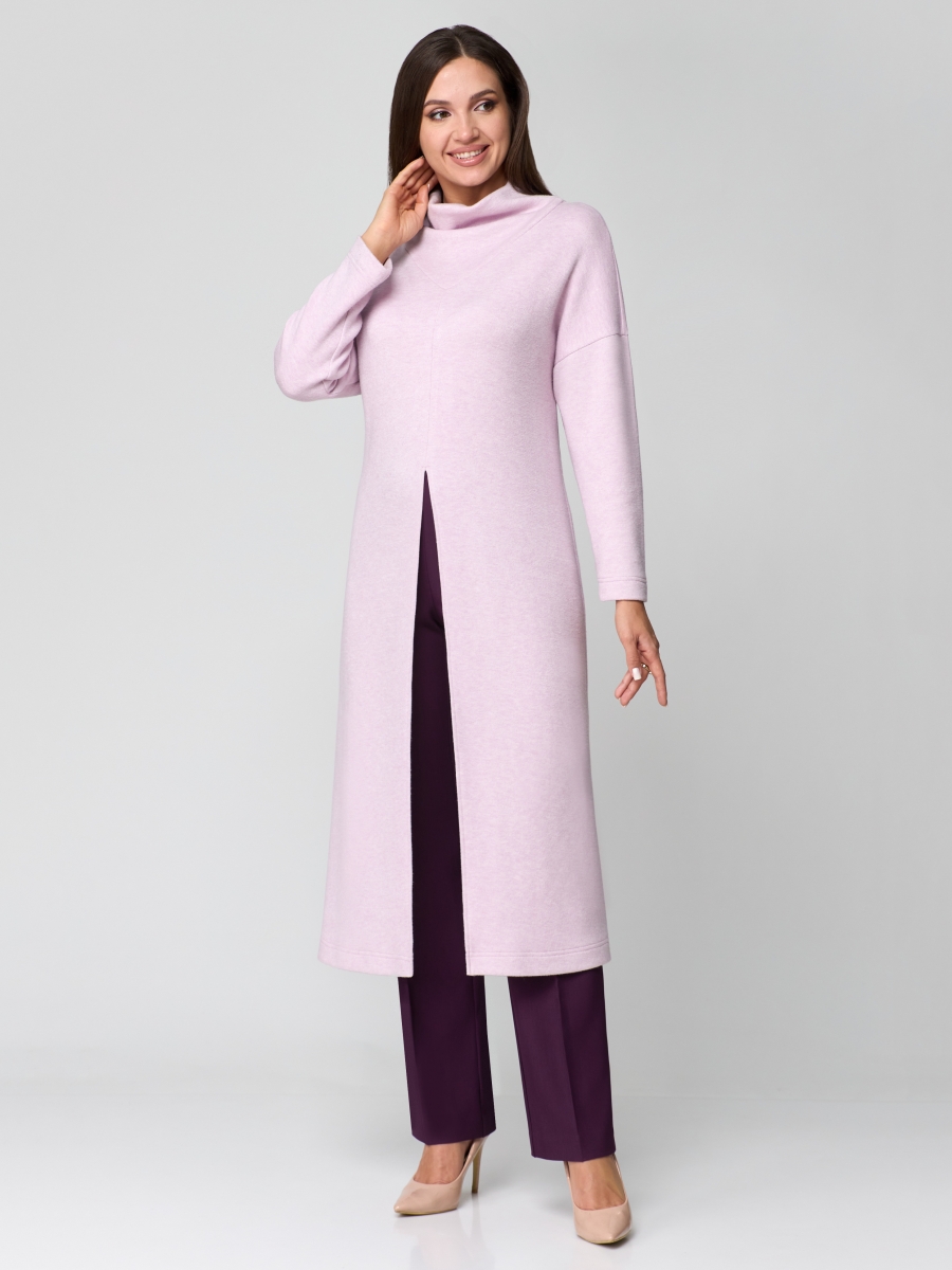 Туника из мягкого теплого трикотажного полотна со швом по переду и удлиненым разрезом. Линия плеча спушенна, рукав одношовный, воротник стойка.