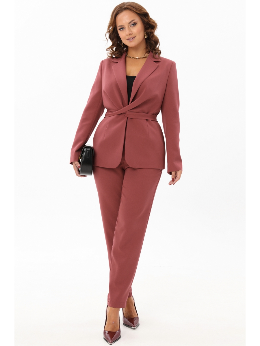 Интересный брючный комплект выполнен из костюмно-плательной ткани. Состоит из жакета на завязках и зауженных брюк.