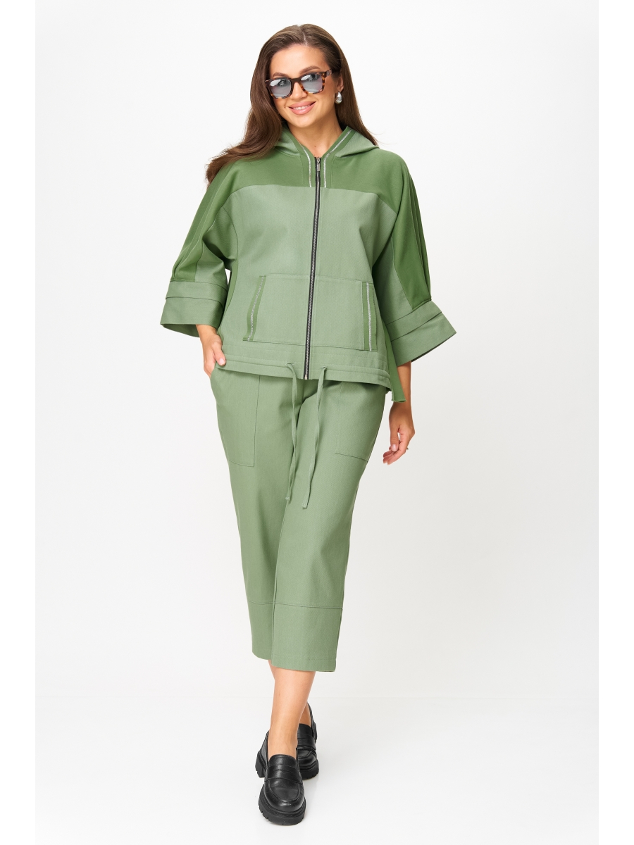 Кофта оверсайз на молнии с капюшоном прямого силуэта. Рукав 3/4 длинный с двойной манжетой. По полочке идут накладные карманы, по низу - кулиска. В качестве декора по капюшону и накладным карманам - отделочная тесьма.