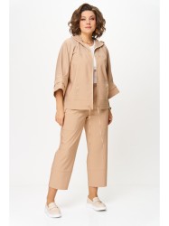 Кофта оверсайз на молнии с капюшоном прямого силуэта. Рукав 3/4 длинный с двойной манжетой. По полочке идут накладные карманы, по низу-кулиска. В качестве декора по капюшону и накладным карманам - отделочная тесьма.