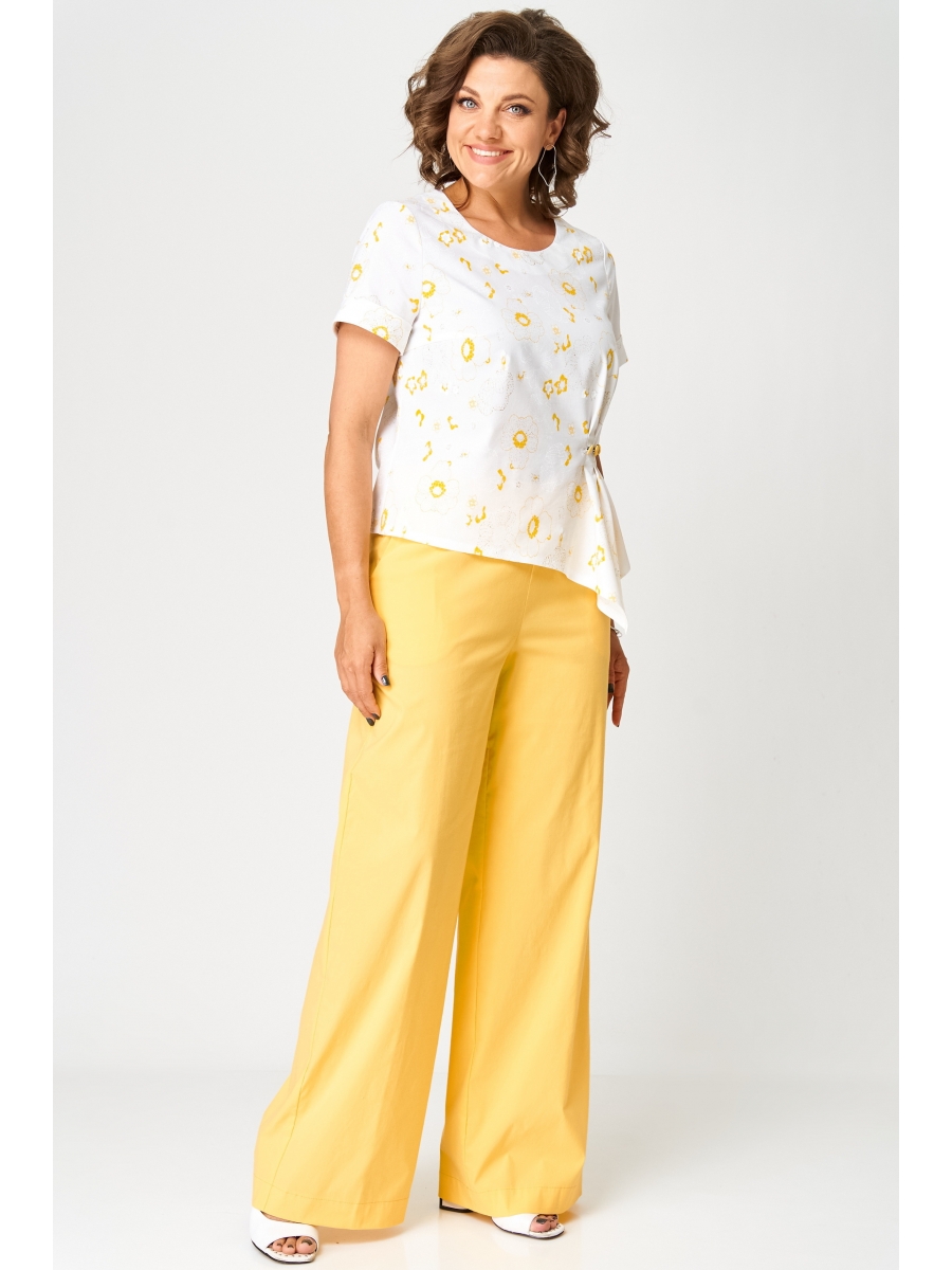 Базовый брючный комплект, состоящий из оригинальной блузки и ярких брюк-палаццо.