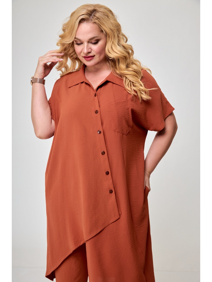 Туника асимметричного кроя длина миди, асимметричная застежка по переду на петли пуговицы. Рукав цельно выкроенный короткий. Горловина обработана воротником. По боковым швам разрезы.