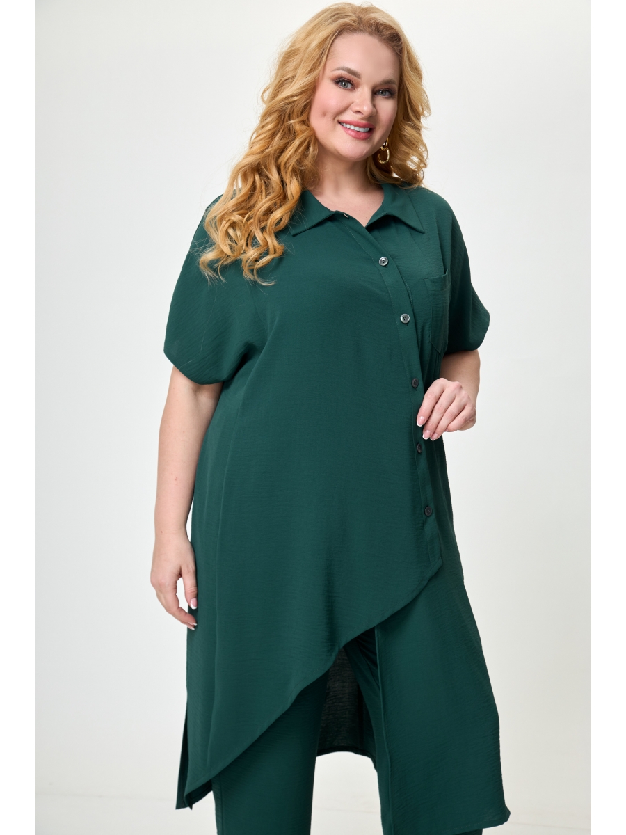 Туника асимметричного кроя длина миди, асимметричная застежка по переду на петли пуговицы. Рукав цельно выкроенный короткий. Горловина обработана воротником. По боковым швам разрезы.
