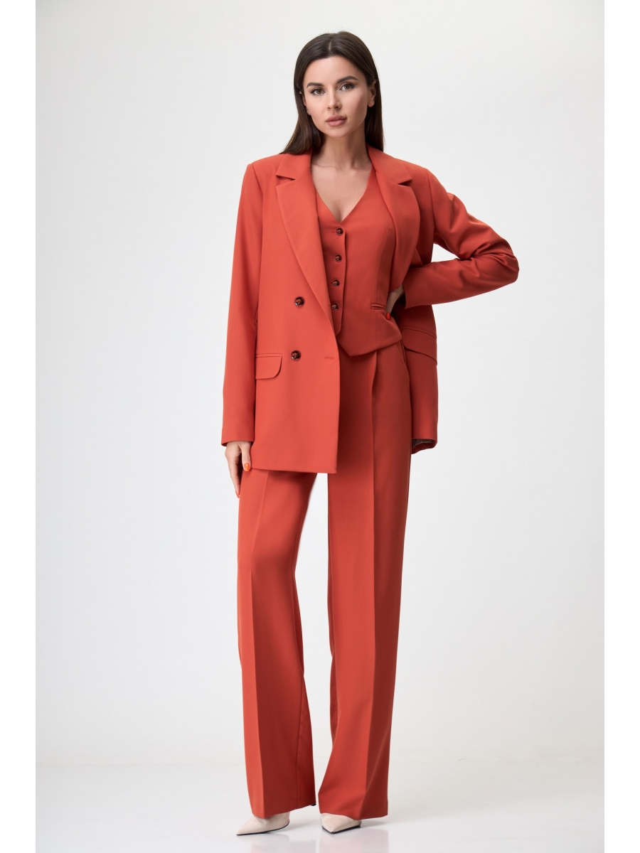 В комплект входят брюки, жакет и жилет. Сегодня сложно представить гардероб современной женщины без брючного костюма. Он актуален на всех мероприятиях, является базой офисной одежды и городской моды. Жакет двубортный, прямого свободного силуэта с втачными рукавами, отложным воротником и лацканами, функциональными прорезными карманами с клапаном. Спинка со средним швом. Жакет и жилет выполнены на подкладке. Жилет полуприлегающего силуэта, с рельефами по переду и спинке, v-образным вырезом горловины, застежкой на пуговицы, нерабочими карманами в рамку, по спинке регулируемый хлястик в области талии. Брюки классического покроя с завышенной линией талии, с боковыми функциональными карманами по переду, с притачным поясом. Комплект выполнен из однотонной ткани. Не упустите возможность приобрести комплект – он будет радовать вас не один сезон!