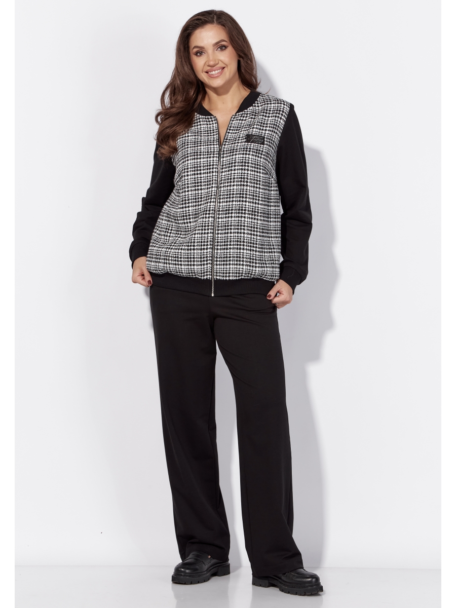 Бомбер прямого силуэта, изготовлен из текстильной ткани в клетку (букле) и трикотажного полотна. По переду нагрудные вытачки, отделочная нашивка. Карманы в боковых швах. Застежка центральная на тесьму "молния" Вырез горловины круглой формы с подрезной бейкой. Бейка горловины, манжеты рукавов и низа изделия из эластичного трикотажного полотна (кашкарсе).
