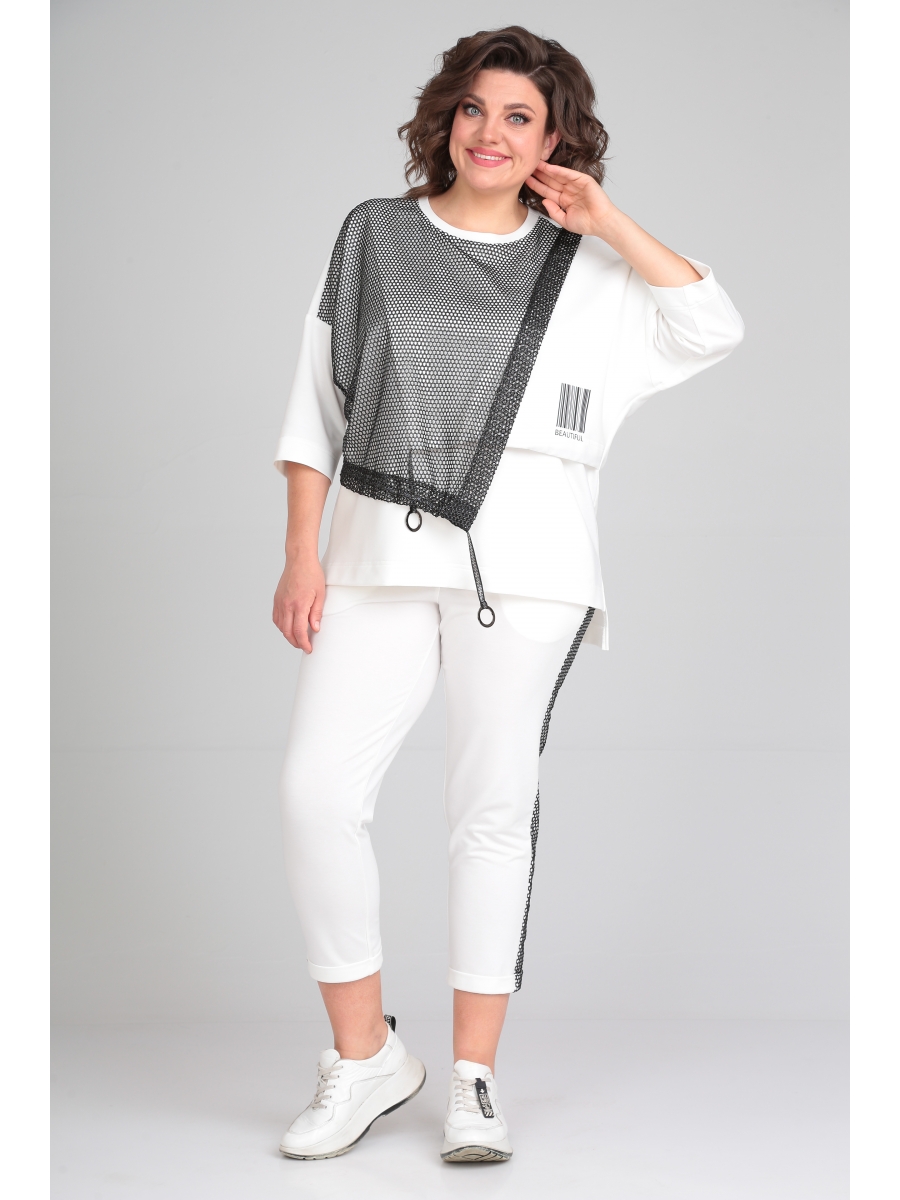 Удобный костюм выполнен из мягкого и уютного трикотажа. Брюки укороченные, свободного кроя с отворотом, будут прекрасно смотреться как на высоких, так и на миниатюрных девушках. В брюках функциональные боковые карманы, пояс на резинке, украшены крупной сеткой на лампасах. Джемпер свободного кроя, плечо приспущено, рукав ¾, украшен принтом в виде «штрихкода». Перед короче относительно спинки, по бокам разрезы, украшением служат отлетные детали со стяжками на крупных кольцах по низу. Сложный крой и функциональность костюма делает его особенным и самостоятельным. Оба изделия можно смело комбинировать с другими вещами и обувью Вашего гардероба.