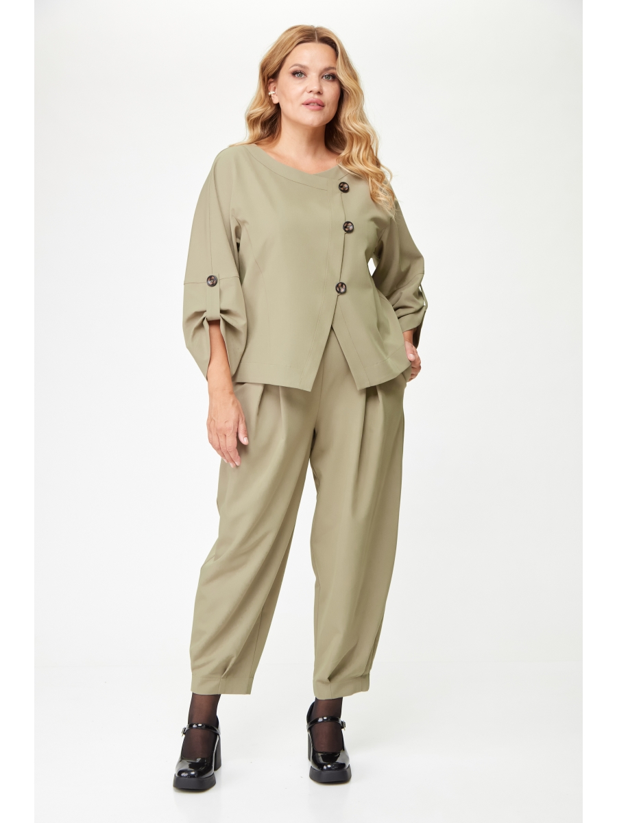 Жакет укороченный с цельнокроенным рукавом длиной 7/8 с патой, закрепленной пуговицей. Перед жакета с ассиметричной косой застежкой на навесные петли с пуговицами.
