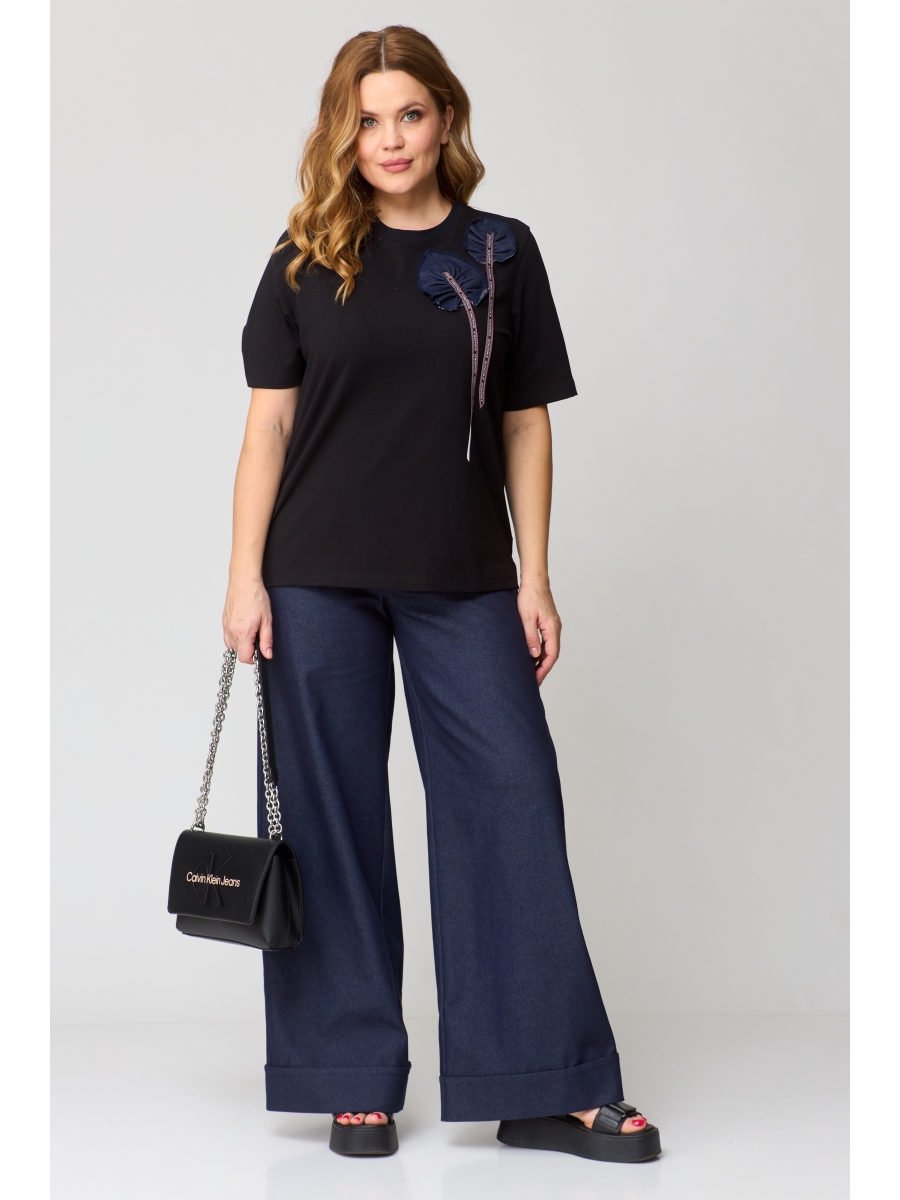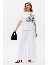 Данный комплект может быть как нарядным, так и для повседневной носки. Изделие состоит из футболки и джинсовых брюк-палаццо.