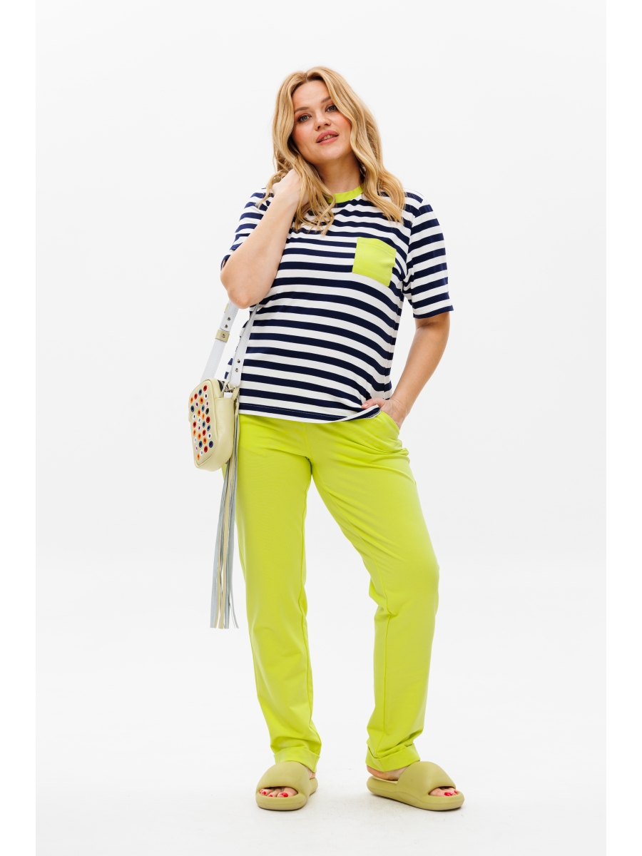 Футболка свободного кроя, выполнена из мягкой приятной на ощупь вискозной ткани. Горловина - контрастная в цвет брюк, а также по переду карман.