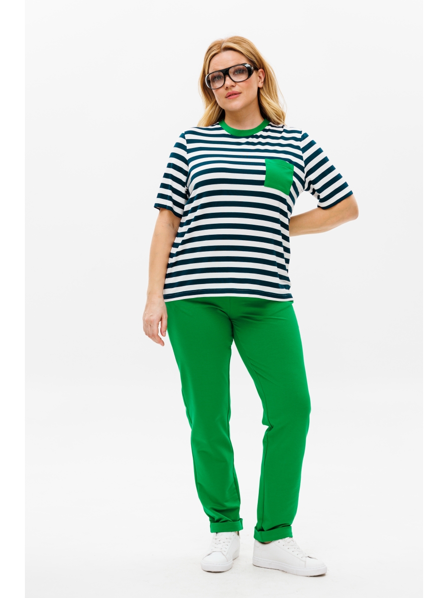 Футболка свободного кроя, выполнена из мягкой приятной на ощупь вискозной ткани. Горловина - контрастная в цвет брюк, а также по переду карман.
