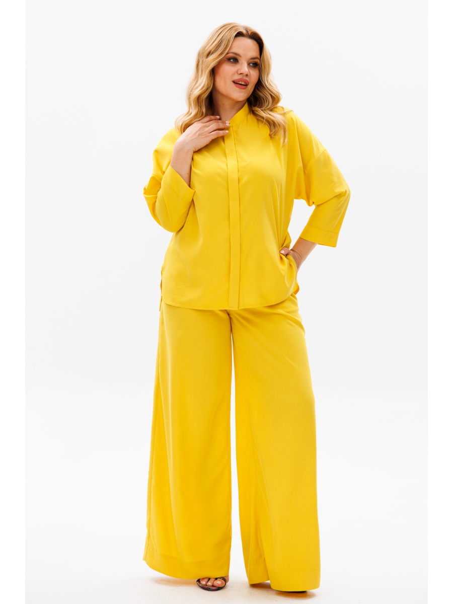 Блуза оверсайз с круглой горловиной на стойке. Перед с центральной потайной застежкой планкой на петли-пуговицы. Спинка цельная со встречной складкой из-под стойки. Плечо спущено с втачным рукавом 3/4 и широкой подгибкой.