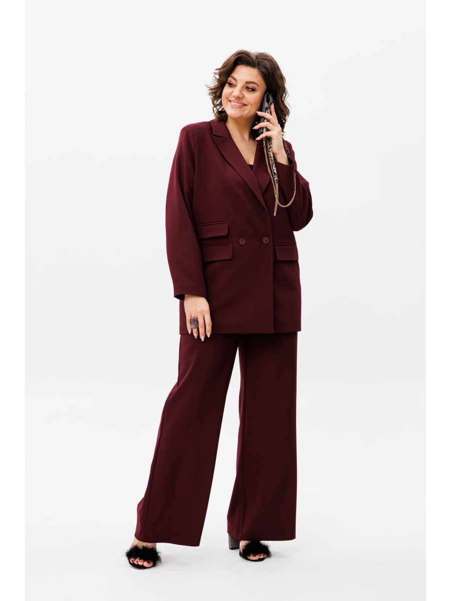 Прямой двухбортный жакет, брюки на резинке по спинке и с карманами.