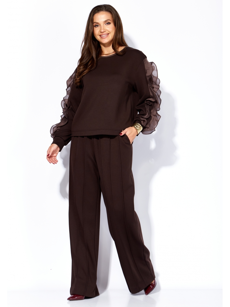 Джемпер прямого силуэта, с длинным рукавом. Рукава с чуть спущенной линией плеча, по низу на манжете, задекорирован по центру тремя рядами рюш из отделочной ткани. Вырез горловины круглой формы, с отделочной бейкой по переду. По низу переда подрезная планка. Спинка без особенностей.