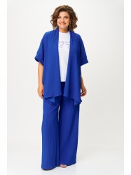 В его состав входит стильный кардиган из плиссированного однотонного трикотажа с распашной застежкой, коротким цельнокроеным рукавом с притачной манжетой и фигурным низом, а также длинные брюки-палаццо на эластичном поясе с резинкой — комфортные и модные.