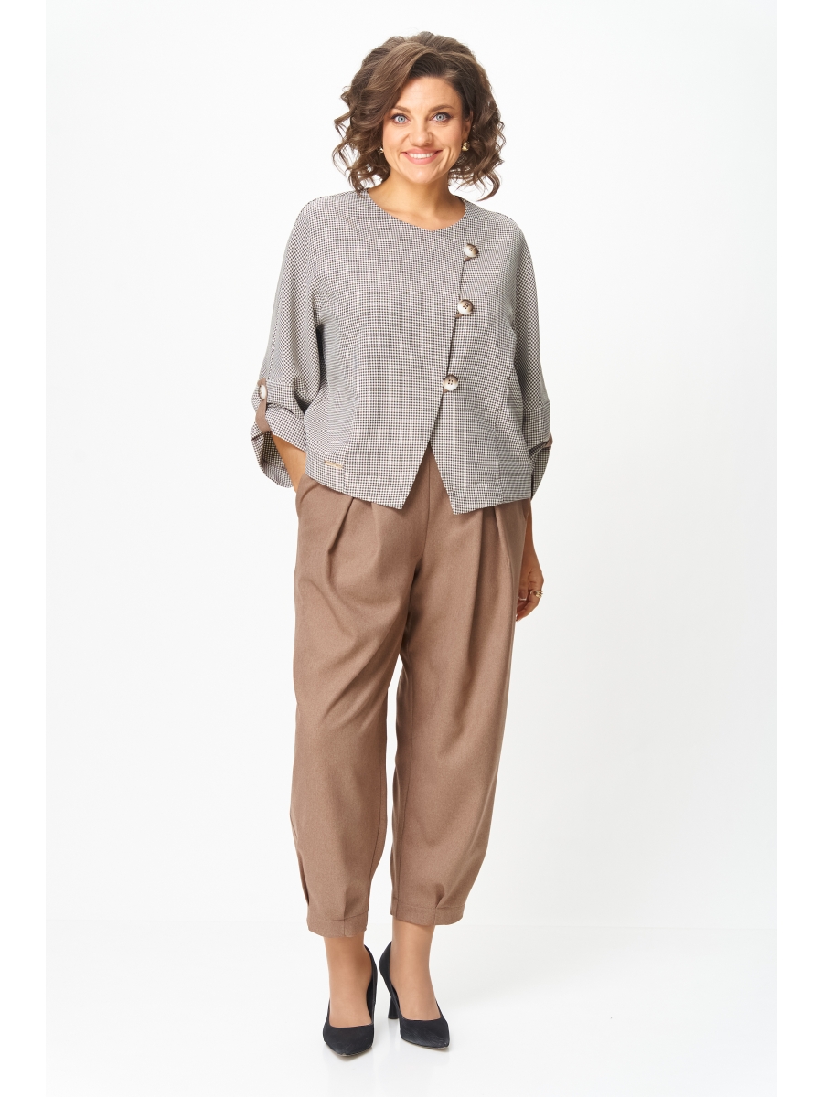 Универсальный костюм, который выглядит дорого и современно, но при этом дарит комфорт и лёгкость. Его можно носить как комплект или по отдельности: жакет с асимметричной застёжкой и акцентными пуговицами легко сочетается с джинсами, а брюки свободного кроя идеально смотрятся с блузой или футболкой.
