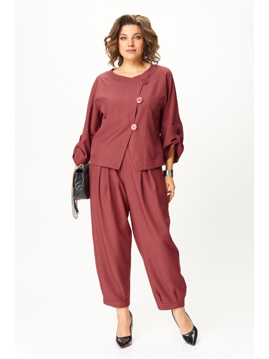 Универсальный костюм, который выглядит дорого и современно, но при этом дарит комфорт и лёгкость. Его можно носить как комплект или по отдельности: жакет с асимметричной застёжкой и акцентными пуговицами легко сочетается с джинсами, а брюки свободного кроя идеально смотрятся с блузой или футболкой.