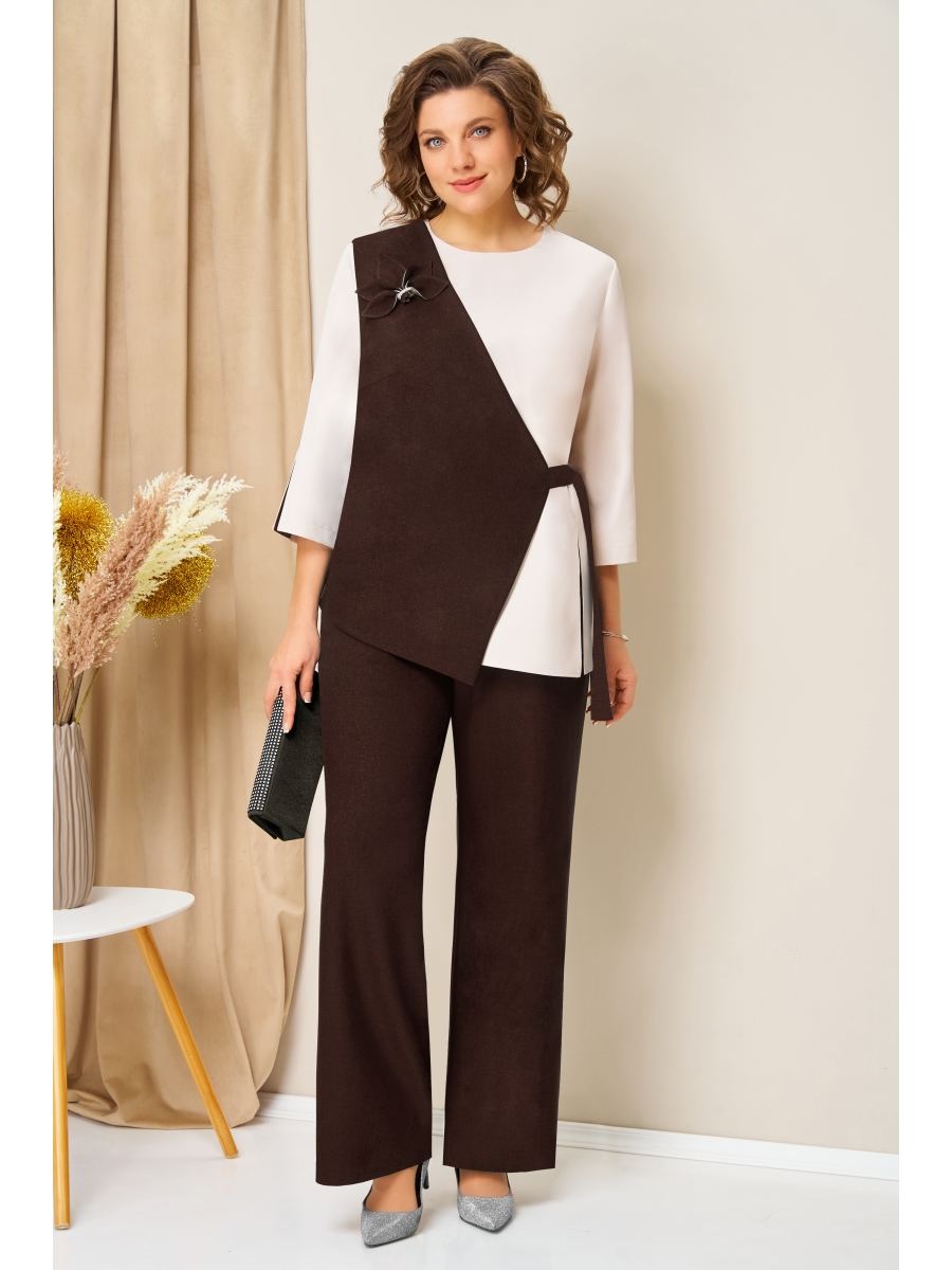 Центральный элемент образа - оригинальный жилет слегка приталенного силуэта, изнутри жилет на круговой подкладке. Съемная брошь-лилия делает комплект еще более нарядным, при этом создает различные варианты для носки.