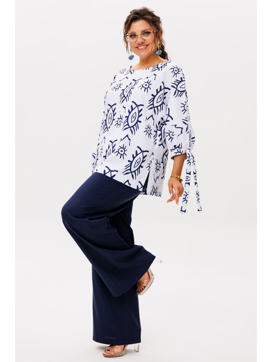 Белая блуза с таинственным принтом «Очи» будто создана для тех, кто ценит не только стиль, но и глубину образа. Свободный крой обволакивает фигуру, подчёркивая её естественную грацию, а изящный вырез «лодочка» добавляет ноту женственности. Рукав, мягко ниспадающий до манжета с деликатными завязками, играет с силуэтом, а боковые разрезы дарят лёгкость каждому движению.