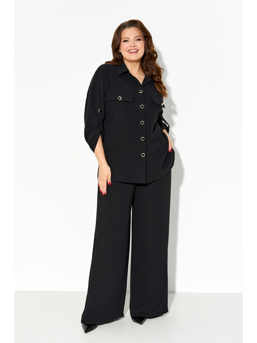 Женский костюм полуприлегающего силуэта, состоящий из рубашки и брюк, выполнен из мягкой костюмной ткани средней плотности.