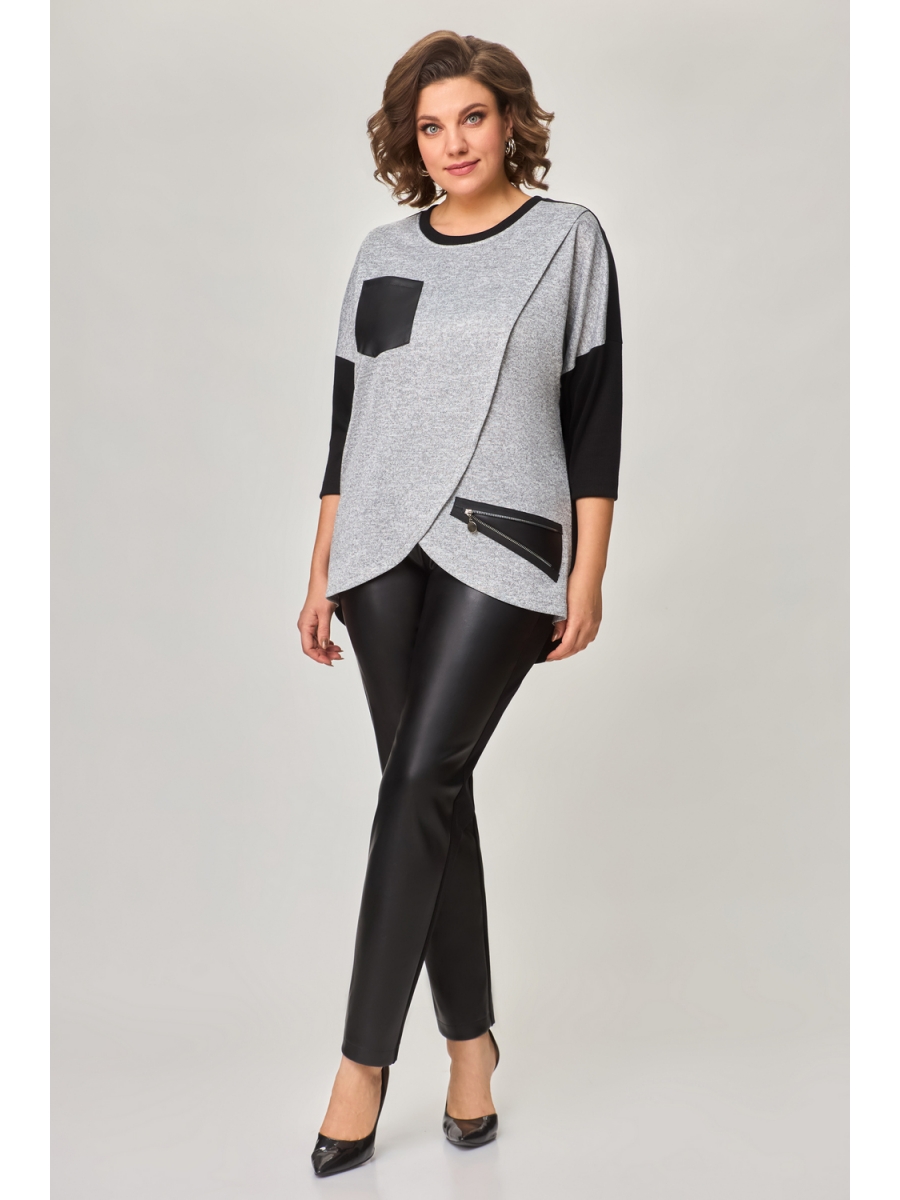 Туника на запах прямого кроя. Горловина округлой формы. Линия плеча спущена. Рукав втачной, длиной ¾. В области линии груди накладной карман, в нижней части декоративная молния. Линия низа закругленная.