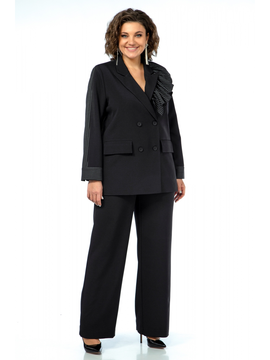 Жакет прямого, свободного силуэта, с двух-бортной застёжкой на петли и пуговицы и с внутренней застёжкой на петлю и пуговицу, перед и спинка на подкладке, по левой стороне декорирован съёмной оборкой пристёгивающаяся под лацканом на пришивные кнопки. Перед с прорезными карманами с листочкой и клапаном. Рукава втачные, двушовные, длинные, понизу с разрезом в локтевом шве и притачными манжетами застёгивающиеся на навесную петлю и пуговицу. Воротник пиджачного типа.