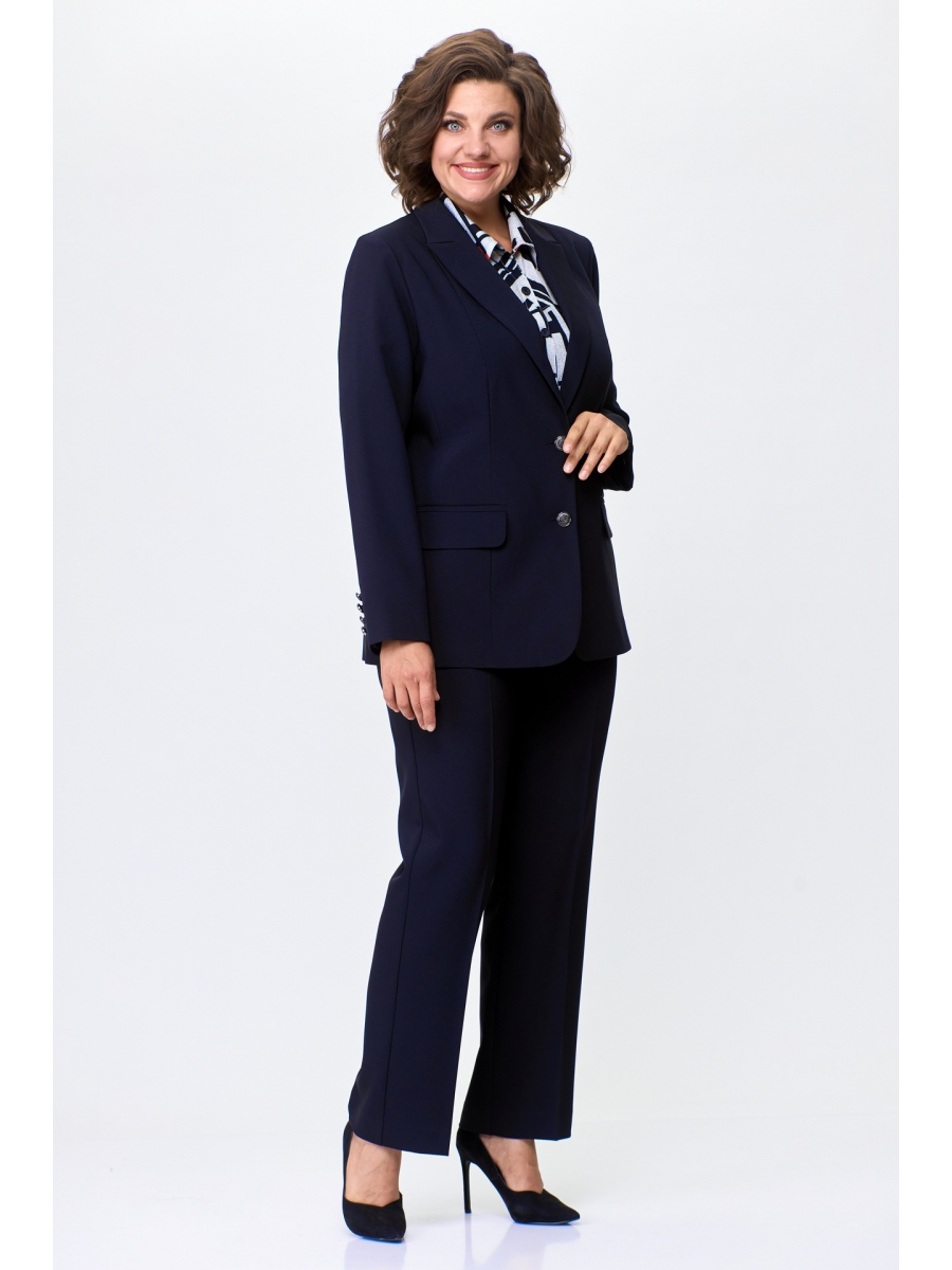 Брюки прямые,классические, с заутюженными стрелками,по переду обработаны карманы с отрезным бочком,застежка на тесьму-молнию и 1 пуговицу.На задних половинках обработаны вытачки и имитация карманов с листочкой, пояс в брюках притачной.
