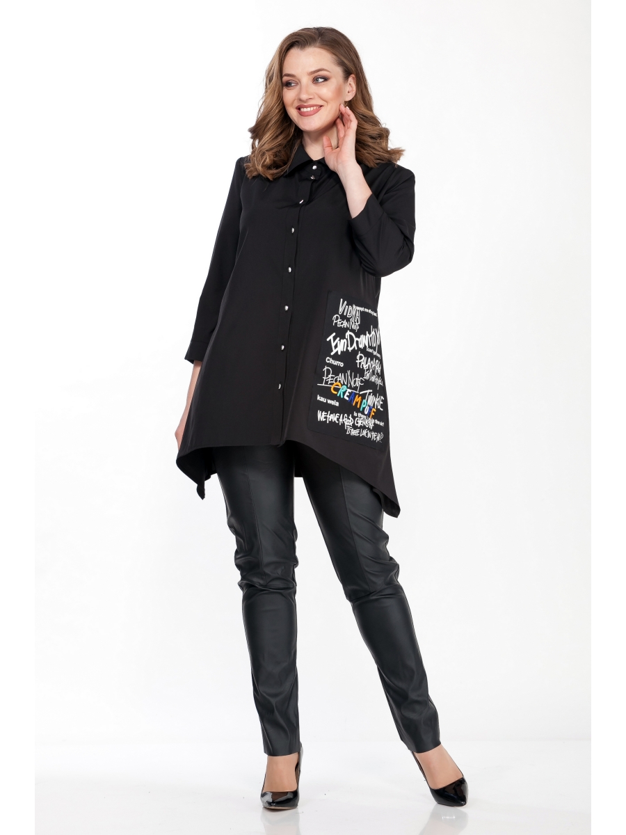 Блузка А-образного силуэта выполнена из плотной блузочной ткани с добавлением эластана, центрально-бортовая застеэжка на петли и пуговицы с воротником рубашечного типа, рукав втачной с пришивными манжетами. Низ блузки асимметричный, на полочке с одной стороны аппликация.
