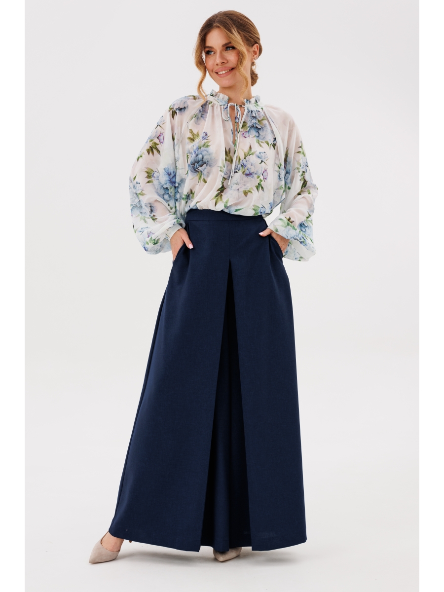 Юбка-брюки А-силуэта с застежкой на потайную тесьму молнию с притачным поясом и карманами спереди. По переду встречная складка.